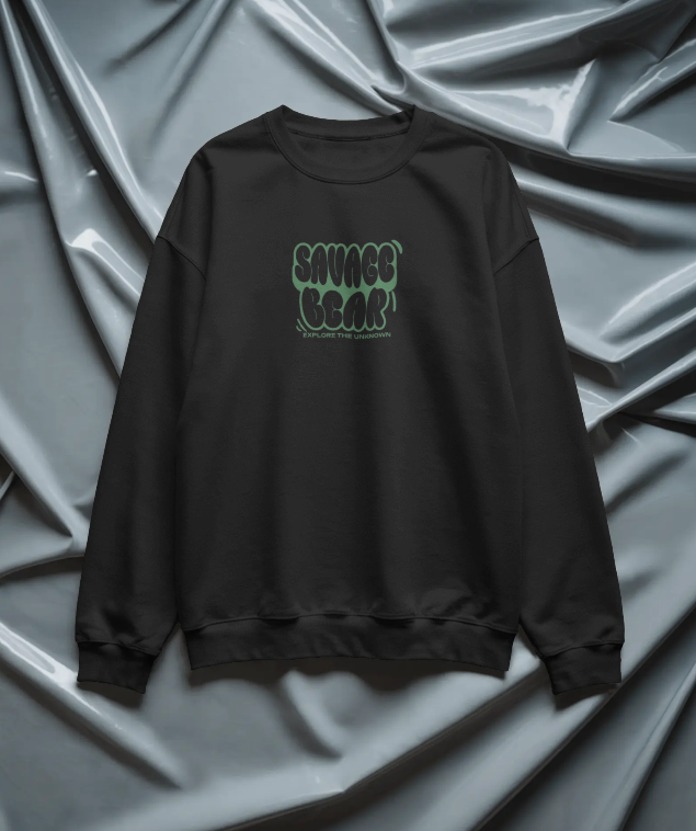 - Black sweatshirt with Savage Bear explore the unknown design on the front
